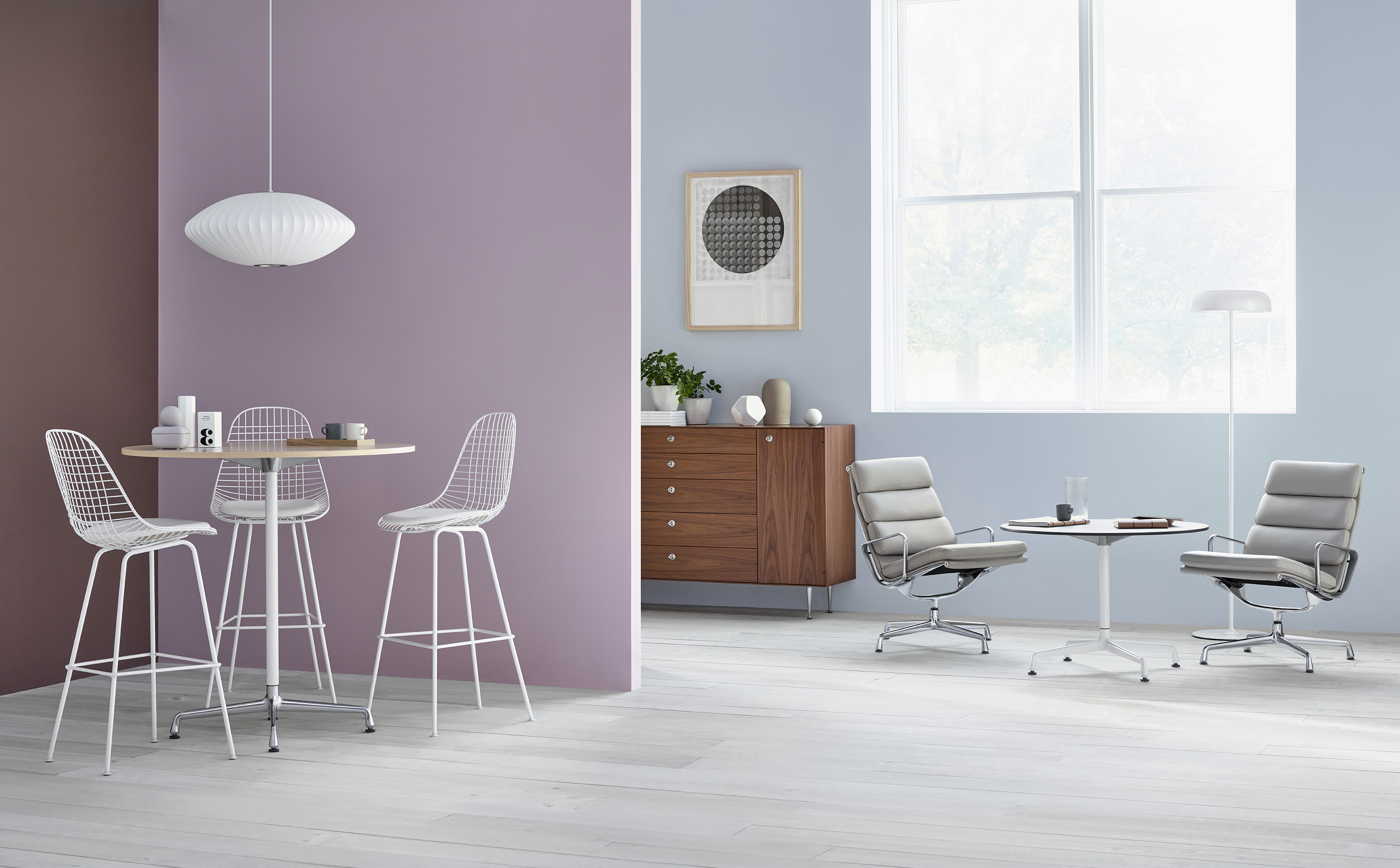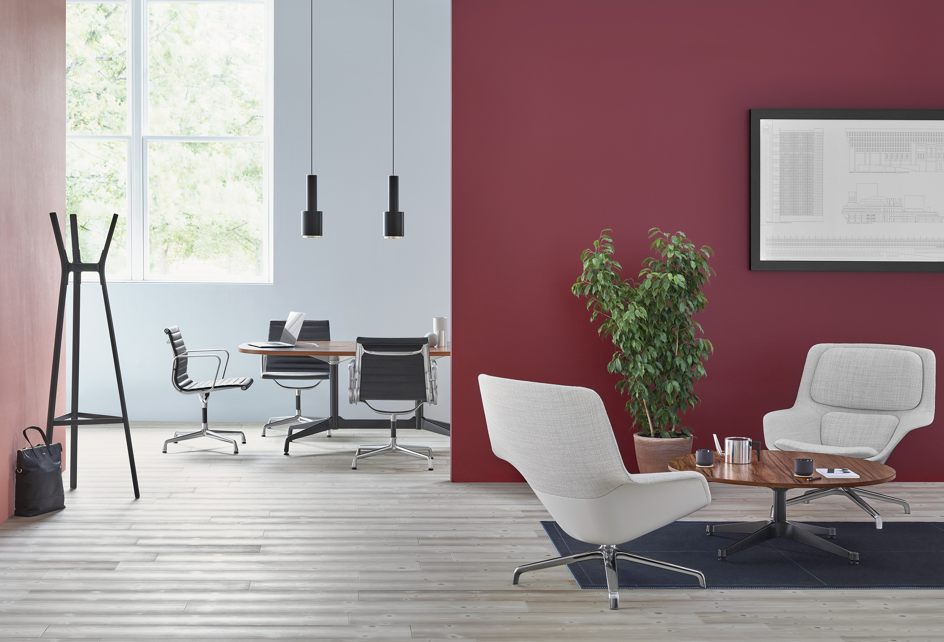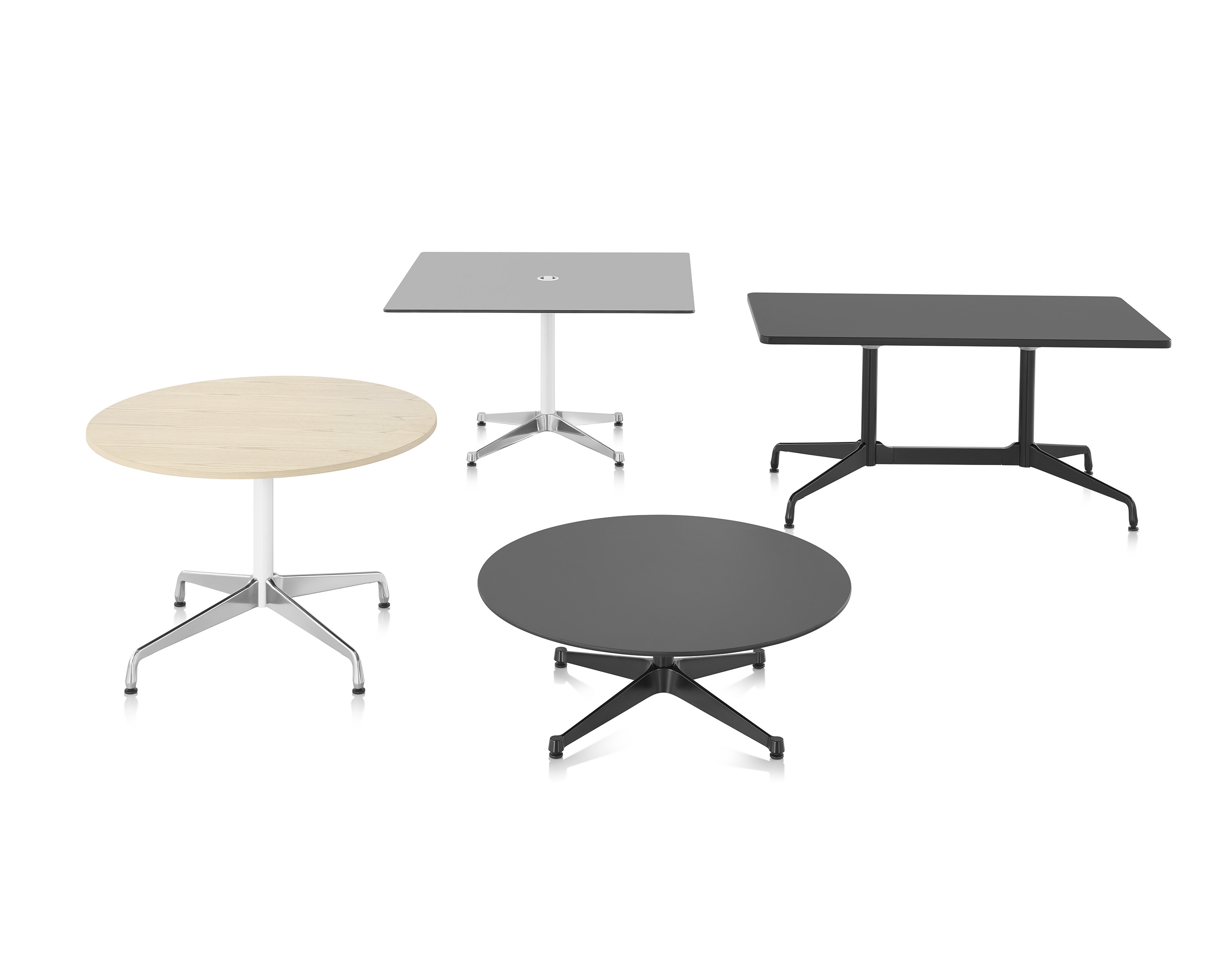 Ya sea en posición alta para trabajar de pie y equipada con tomacorrientes para trabajo grupal, o con una tapa de laminado en alta presión (HPL, por sus siglas en inglés) de perfil delgado para exterior donde tener una reunión o un café, o en alguna de las variadas opciones de configuración, encontrará una mesa Eames para cada necesidad.
