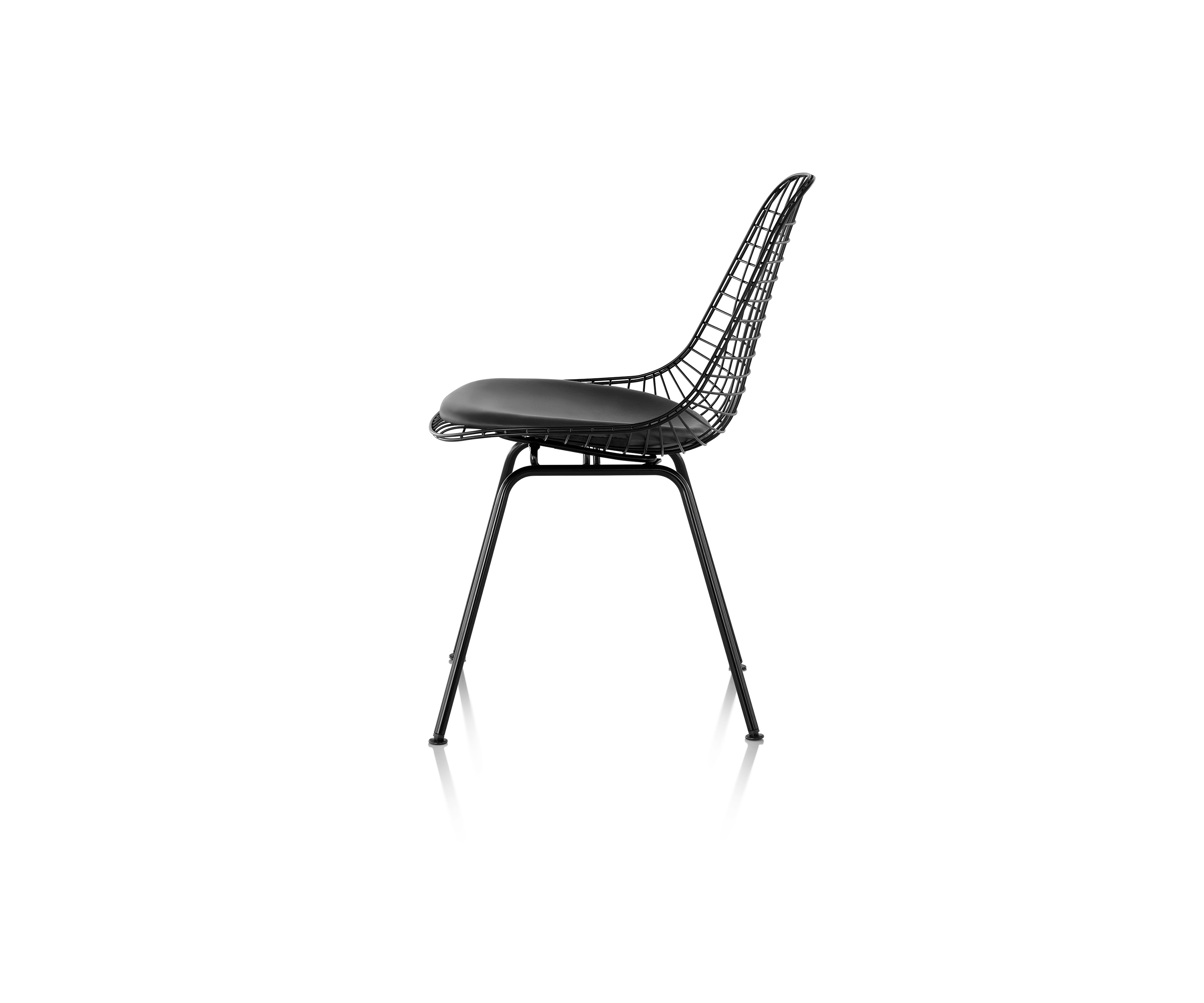 En la década de 1950, Eames Office comenzó a experimentar en el curvado y la soldadura de alambre. Inspirados en bandejas, formas de vestidos y canastas, el equipo desarrolló una serie de piezas, incluida la versión de alambre de la forma Shell. La silla Eames Wire viene con una base de alambre y una almohadilla opcional y entrecruzada o una almohadilla "bikini" de dos piezas realizadas en piel.