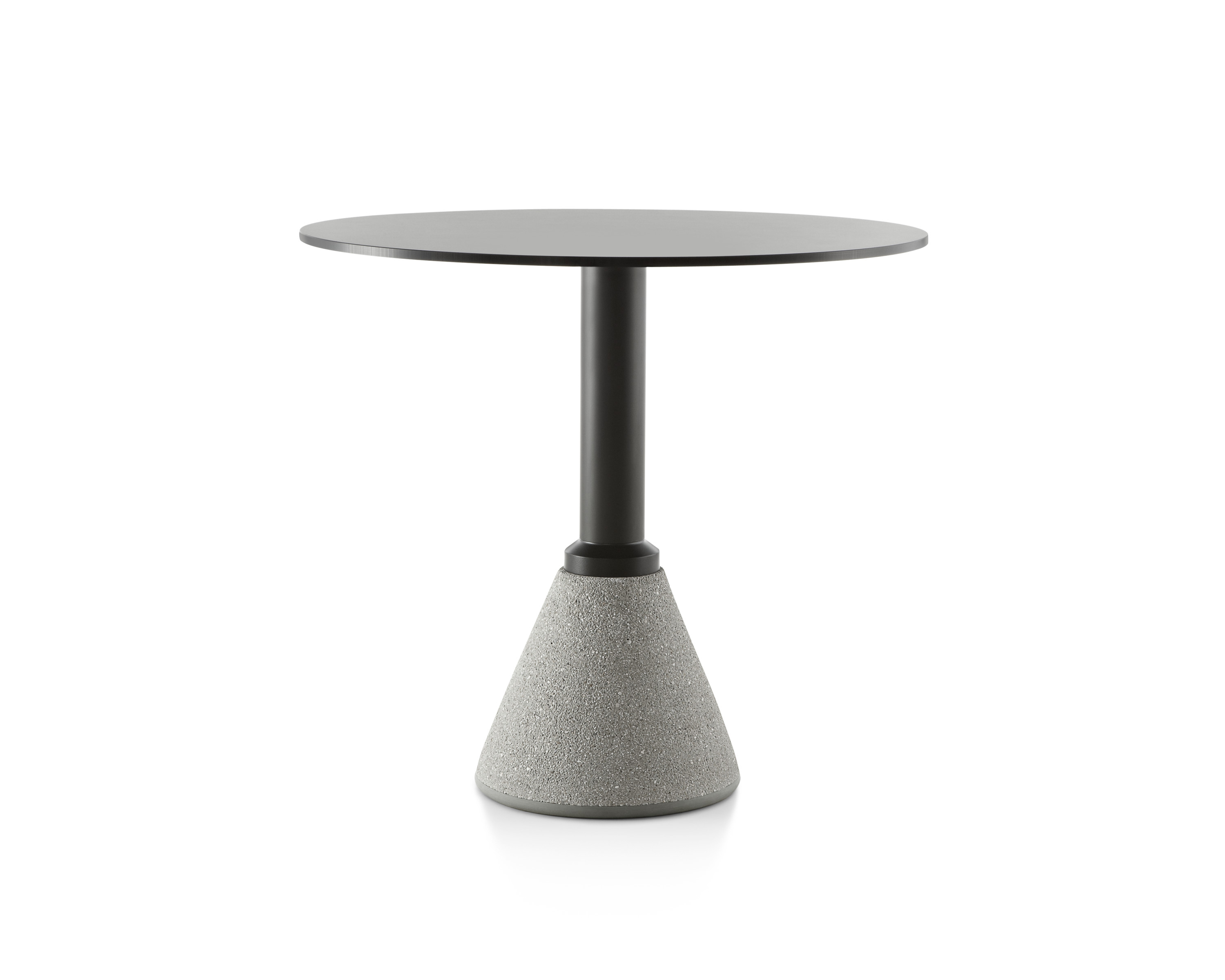 La estructura y las patas son de aluminio anodizado. Las superficies laminadas de alta presión están disponibles en blanco y negro, y las patas en aluminio pulido o pintado de negro. Las mesas totalmente negras (superficie negra, patas negras) pueden usarse al aire libre.