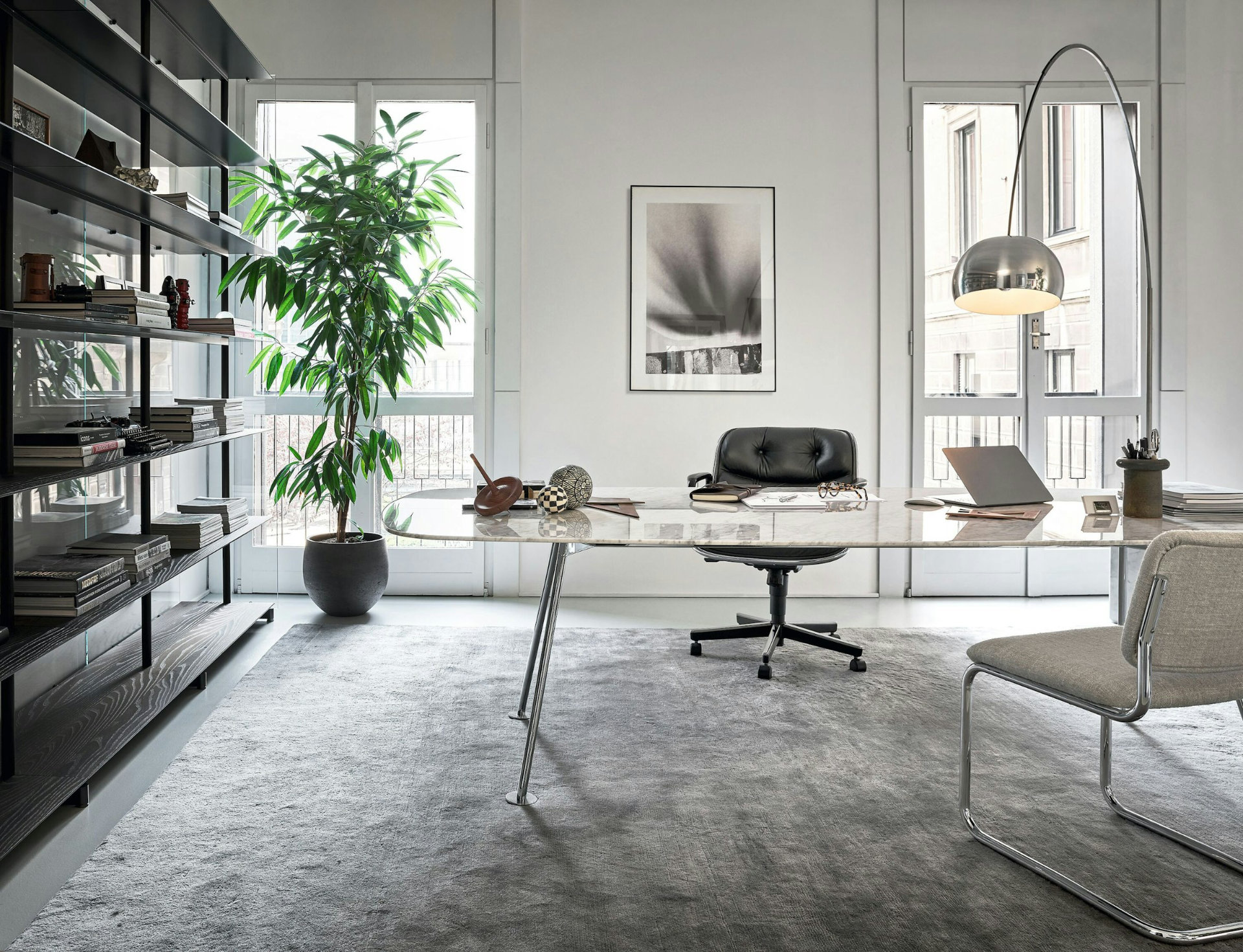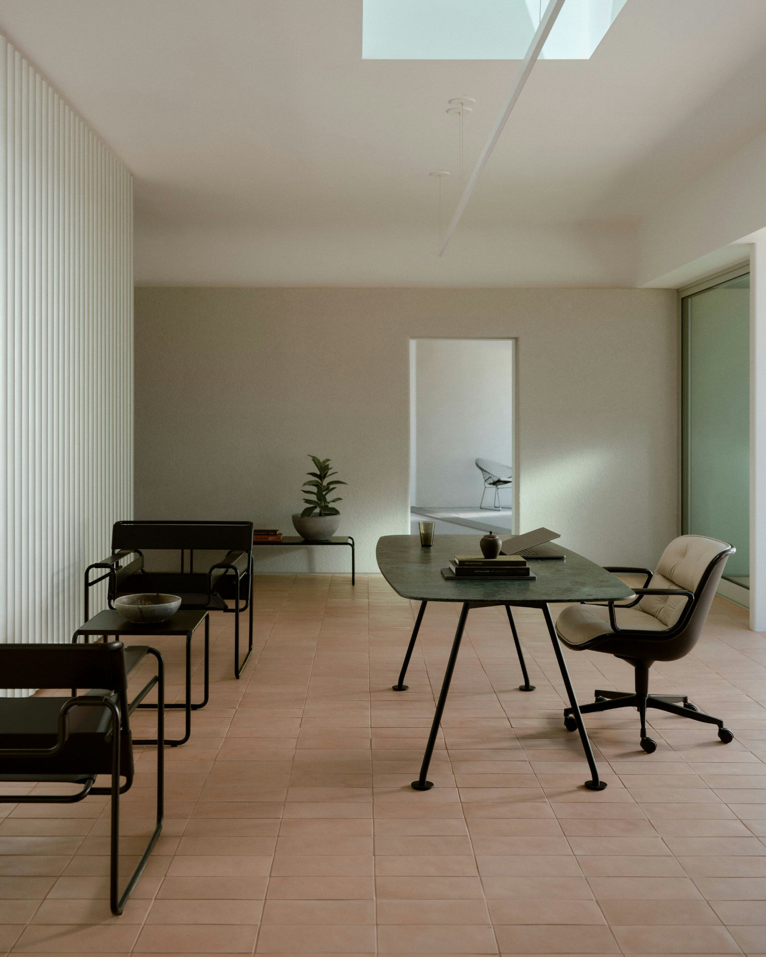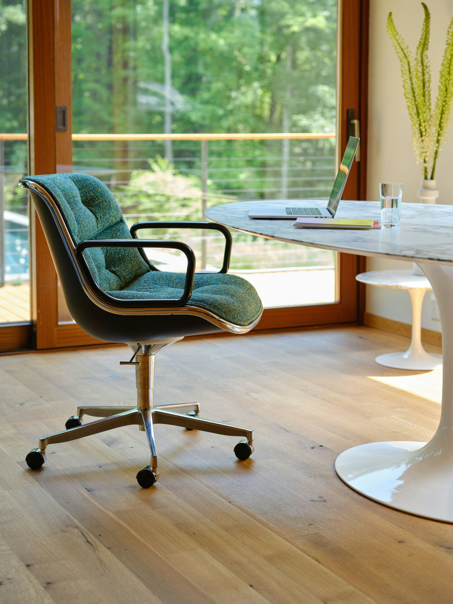La silla ejecutiva de 1963 de Charles Pollock presenta lo que él describió como “tecnología de borde”: el uso de una única banda de aluminio alrededor del perímetro de la silla para mantener unido el diseño, tanto estructural como visualmente. Cincuenta años después de su presentación, la silla Pollock continúa exudando una elegancia atemporal.