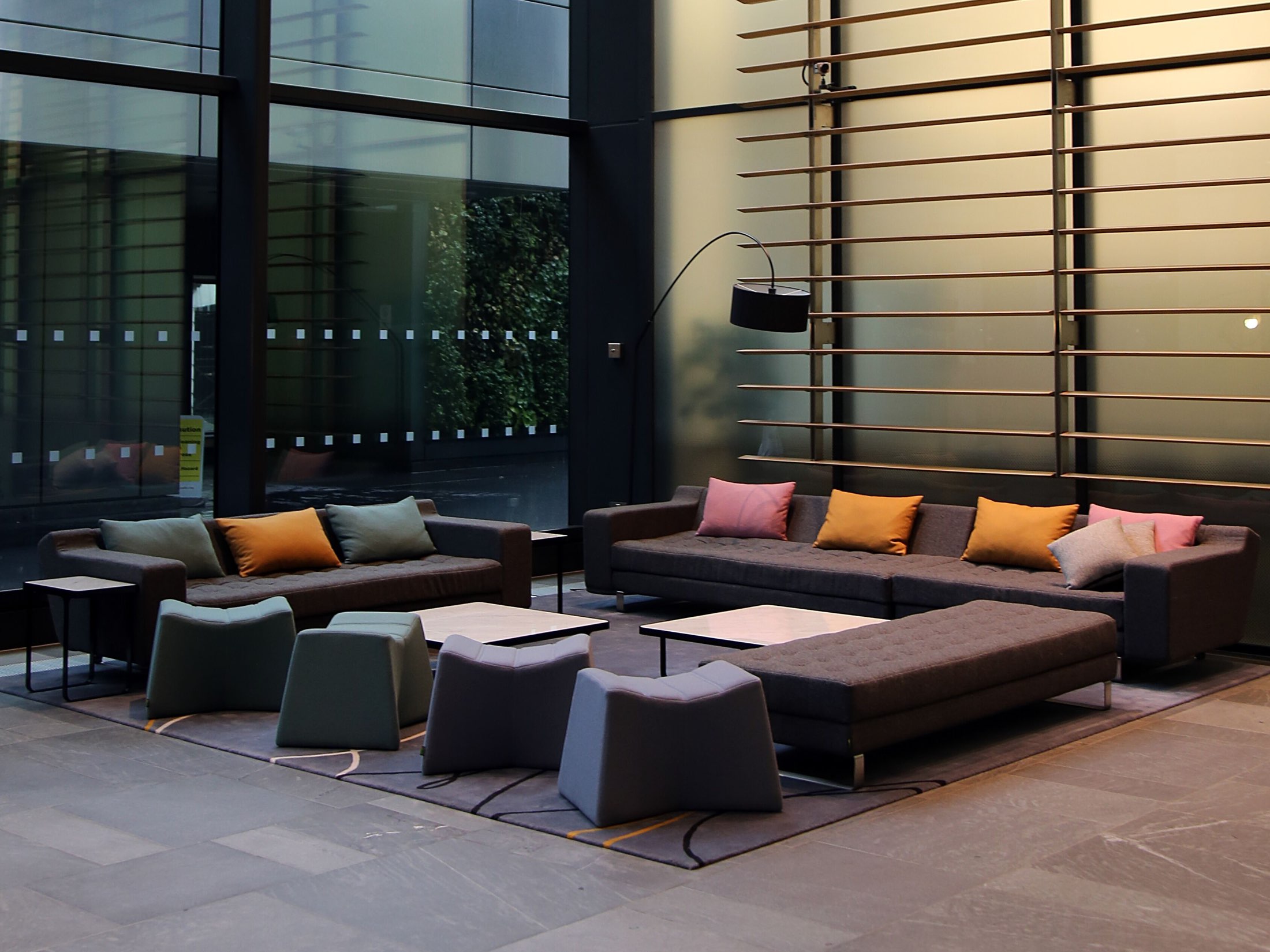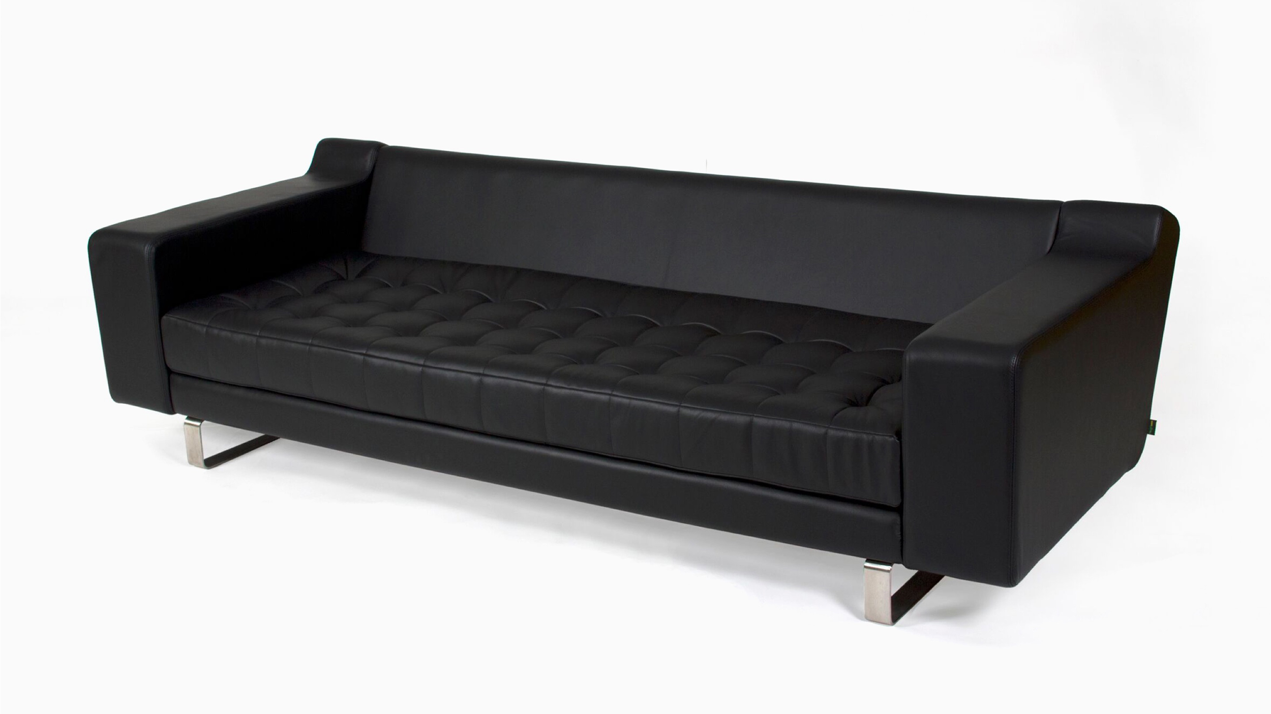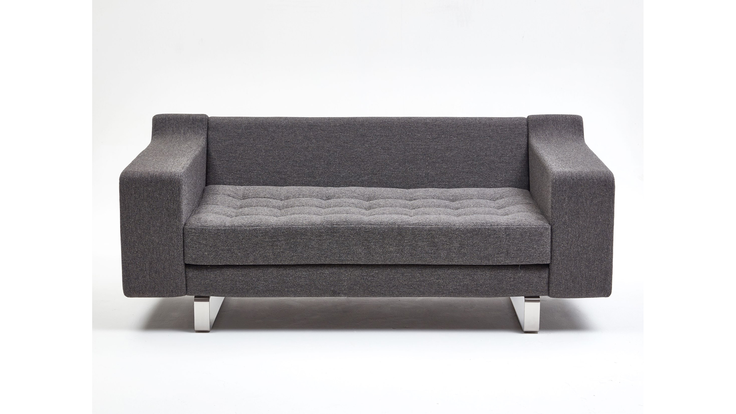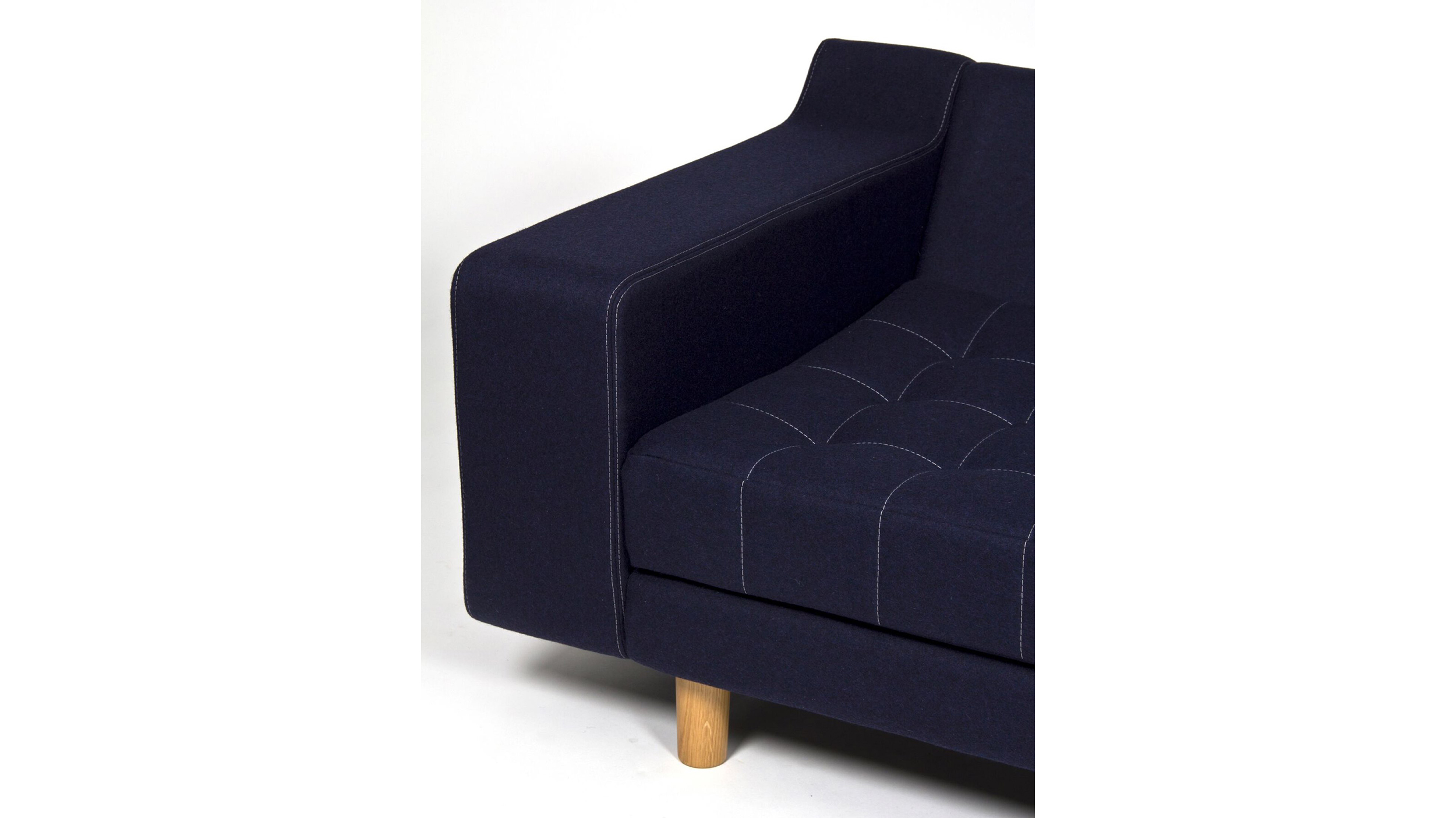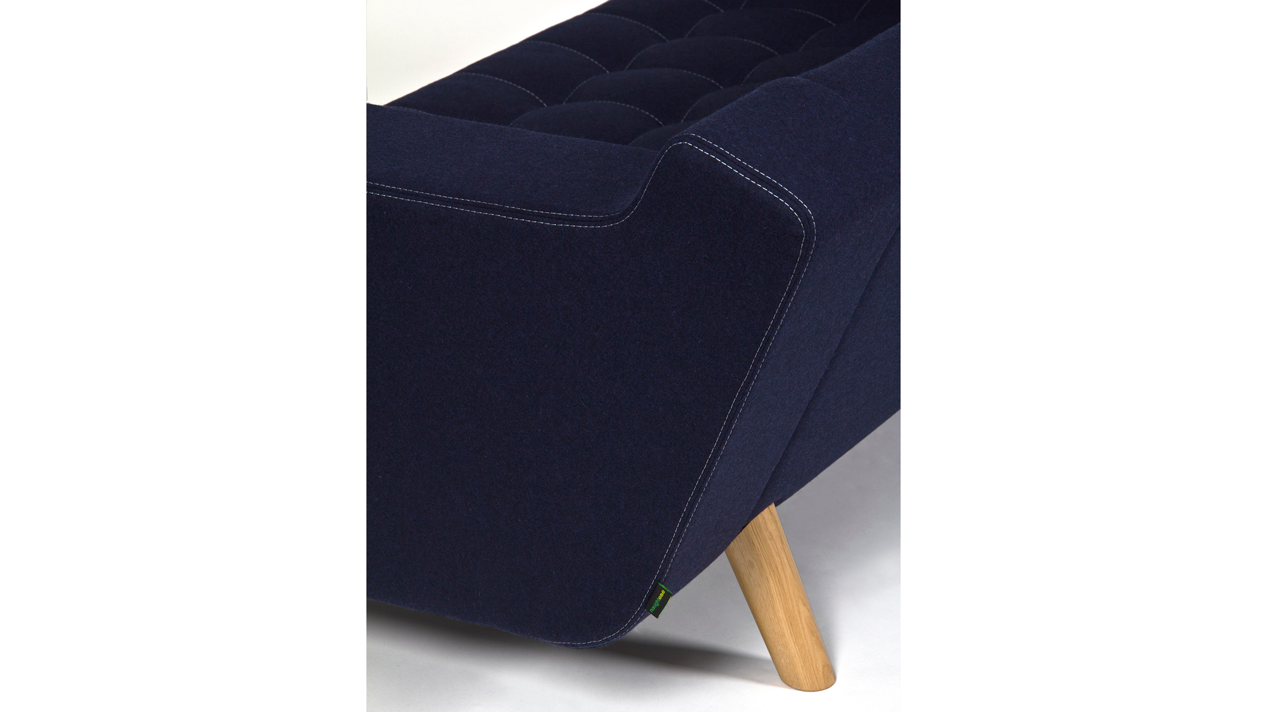 Caracterizado por el asiento acolchonado capitoné y el respaldo reclinado, el sofá Portion de naughtone es profundo, bajo y cómodo, con una forma precisa y despojada. Su estructura de madera dura está recubierta con espuma y puede tapizarse en una amplia variedad de telas. Entre las opciones, puede elegir diferentes tamaños y bases, y especificar si desea costuras y botones contrastantes.